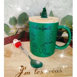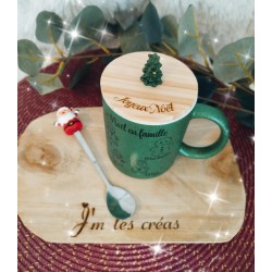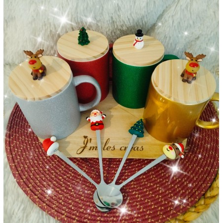 Un mug de Noël tout en paillettes avec son couvercle en bois gravés.