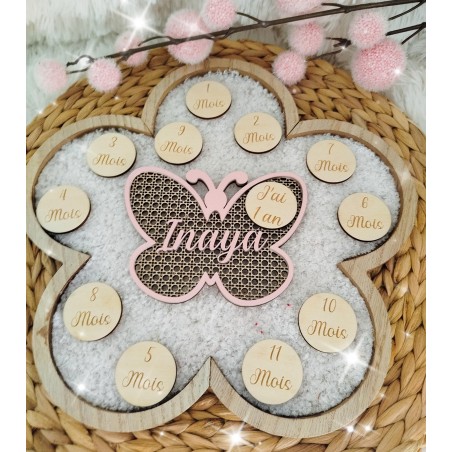 Il est composé d'une forme au choix qui sera découpé dans du bois avec une forme cannage à l'intérieur, d'un prénom mis en couleur comme sur le modèle et de 12 ronds que vous viendrez poser tout les mois jusqu'au 1 an de bébé .