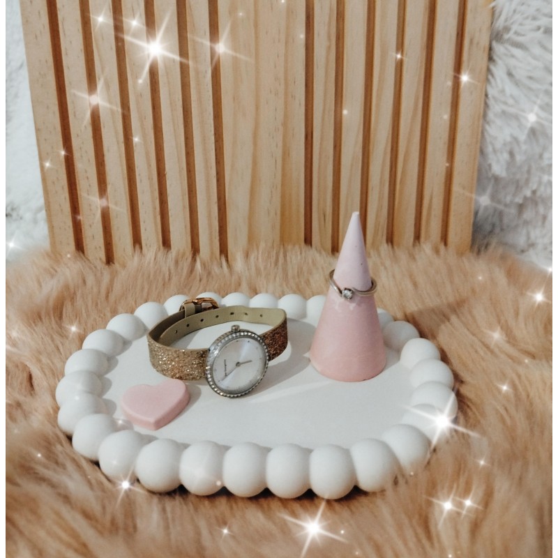 Un plateau fait en résine composé d'un baguier de la couleur de votre choix et un petit coeur pour décoration, les deux de la couleur de votre choix.