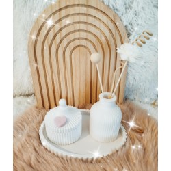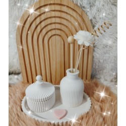 Un plateau de forme ovale, composé d'un vase avec des fleurs en bois et un pot à bijoux, vous pouvez même l'offrir avec des chocolat.