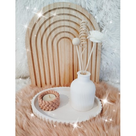 Le plateau mesure 20x14.5 cm , une bougie sera glissé en cadeau dans le bougeoir. Pour la vase vous avez le choix entre rond ou en hauteur et des fleurs en bois seront glissées à l'intérieur comme sur le modèle.