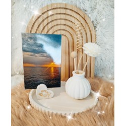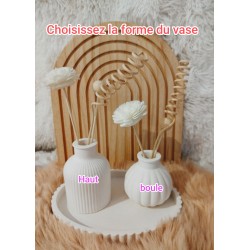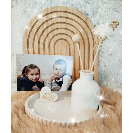 La composition contient un plateau ovale (20x14.5 cm), d'un vase de la forme de votre choix (voir photo) avec des fleurs en bois glissées à l'intérieur et d'un coeur porte photo avec du doré.