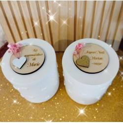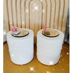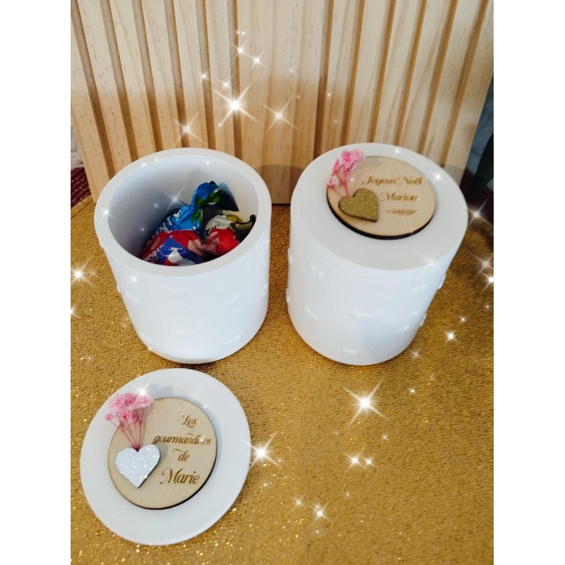 Une bonbonnière à offrir, elle est faite en résine , il y a des coeurs en relief et sur le couvercle un cercle en bois gravé avec ce que vous voulez et une fleur séchée avec un coeur argenté ou doré!