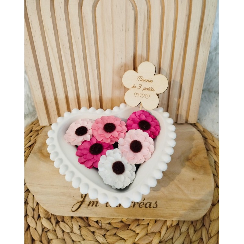 Accompagné d'une pancarte en bois en forme de fleurs comme sur le modèle avec texte au choix. Penser à le préciser dans la personnalisation.