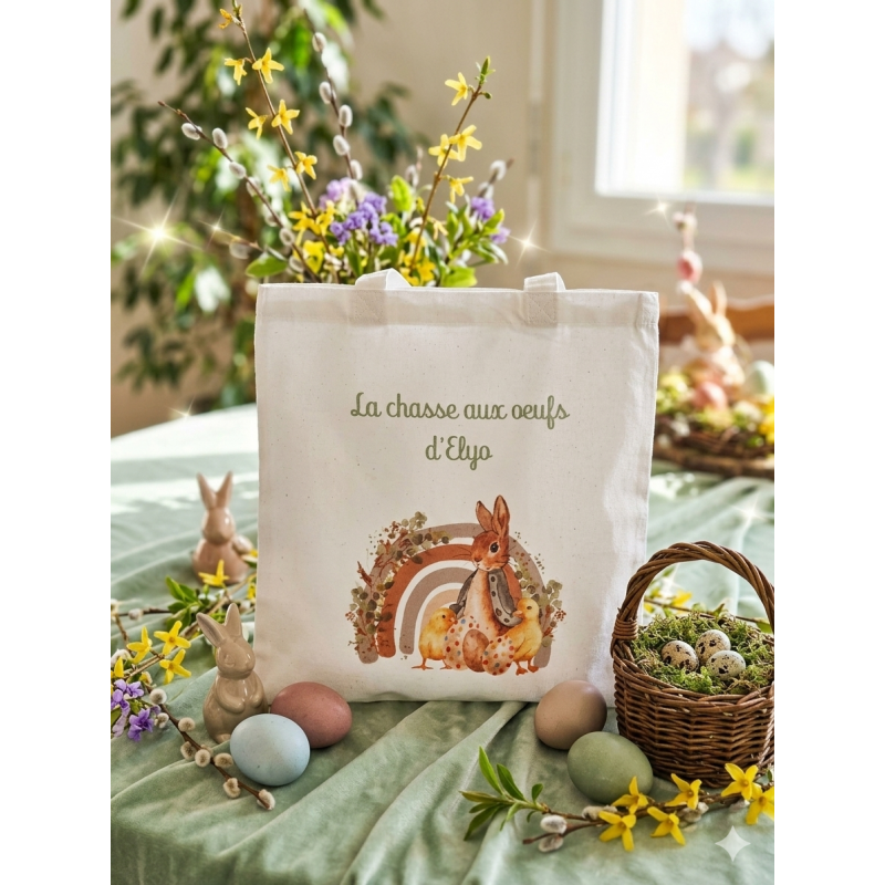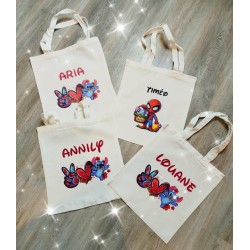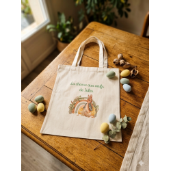 Une tote bag en 100% coton personnalisé avec une image choisie parmi celles que je vous propose et un prénom ou petit texte comme sur le modèle.
